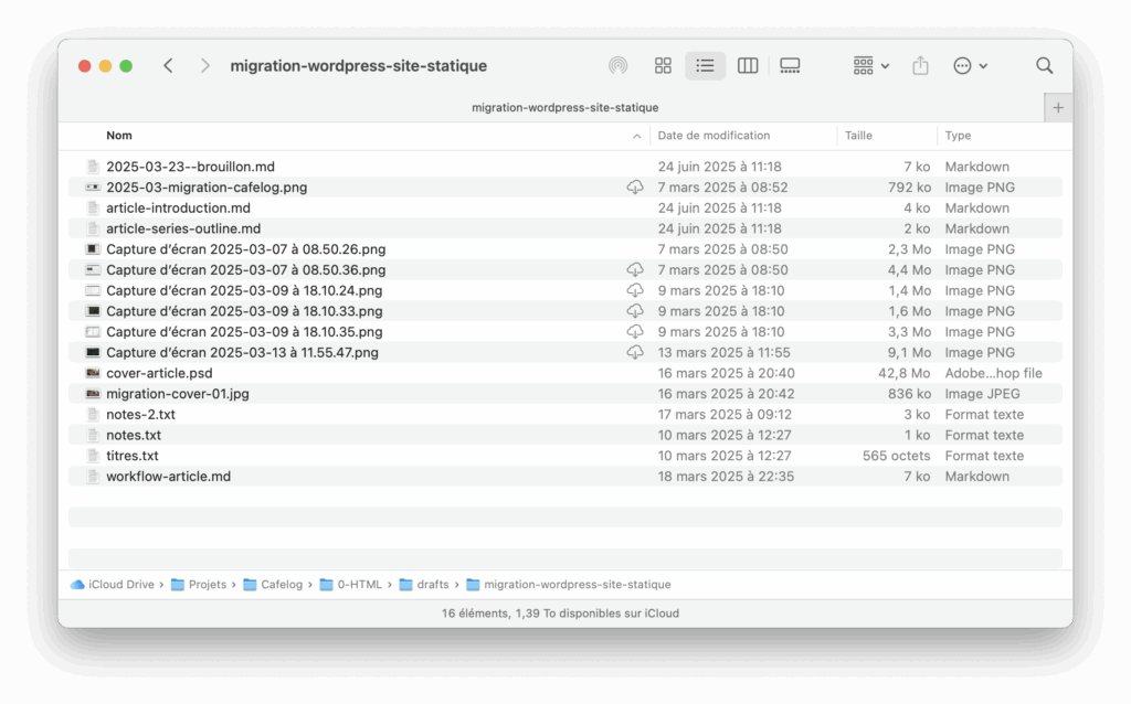 Le site statique que j’avais conçu me demandait de passer par plusieurs étapes pour publier un article ou une page. Voici, en gros, ce que la publication d’un article impliquait une fois celui-ci rédigé avec iA Writer, Notes ou TextEdit.