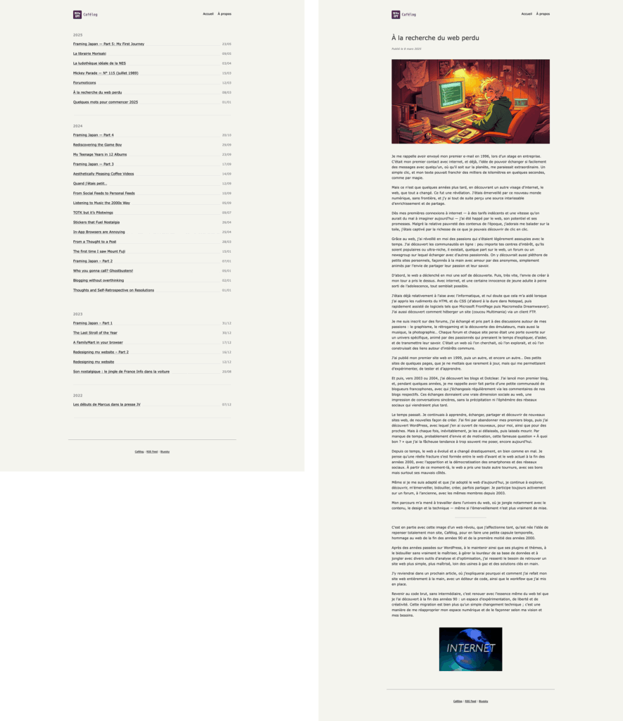 Cependant, j’ai une fois de plus tout remis en question. Hier, j’ai réinstallé WordPress et, à nouveau, migré tout mon contenu. Le besoin de simplicité et de maîtrise que je souhaitais concrétiser via la précédente refonte s’est finalement avéré plus controversé que ce que je l’imaginais. J’avais pourtant pris beaucoup de plaisir à coder et bricoler cette désormais ancienne mouture de Cafélog, version site statique.