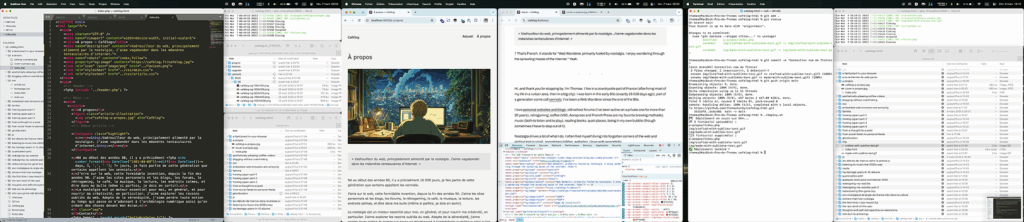 En mars de cette année, j’avais pris la décision d’abandonner WordPress, que je trouvais un peu trop surchargé pour mes besoins. À cette occasion, j’ai totalement repensé mon site et la façon de publier ainsi que de le maintenir. J’ai alors bricolé un site statique, plutôt minimaliste sur la forme comme sur le fond. J’en touche un mot dans l’article À la recherche du web perdu. J’avais pour projet d’écrire un article dédié à cette refonte, sur ma nouvelle façon de m’organiser et de publier. Un article qui, malgré un dossier rempli de notes, d’un brouillon et de captures d’écran, n’aura finalement jamais vu le jour.