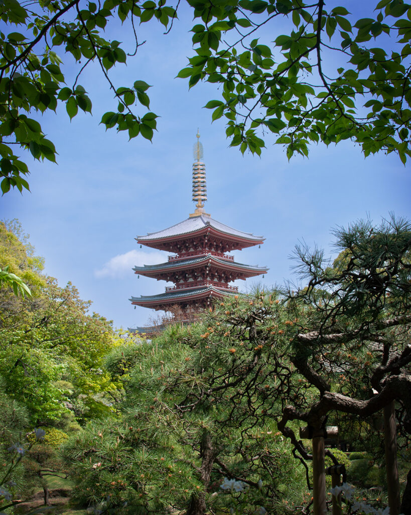 The striking Sensō-ji temple pagoda, in the Asakusa area of Tokyo. If I remember correctly, I took this photo from the Denboi Garden, right beside the pagoda. I find the perspective I chose for this photo interesting. The pagoda is not fully visible, but I like how it contrasts with the blue sky, framed by the various leaves and greenery surrounding me.