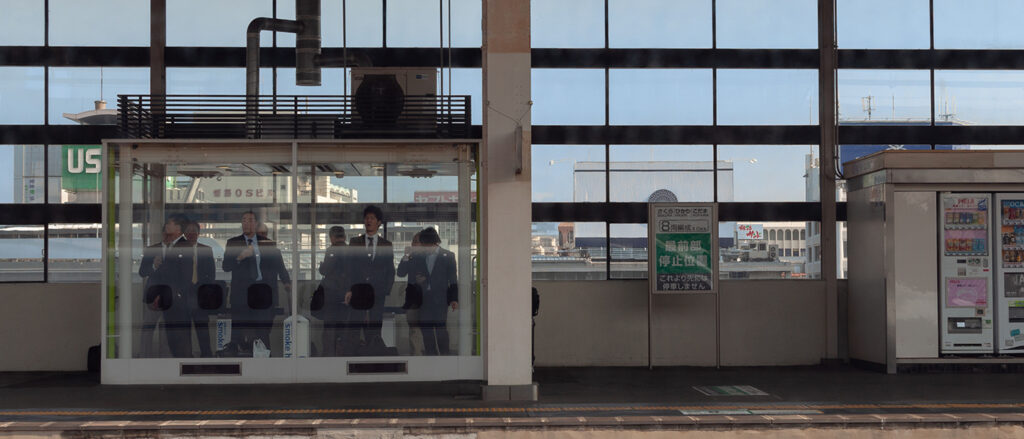 At Shin-Osaka Station, while waiting for the Shinkansen, I was somewhat amused by this group of presumed salarymen, gathered in a glass cabin for a cigarette break. The confined space, resembling an aquarium, reflects the Nozomi Shinkansen on its surface.