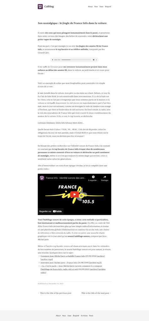 • A design that would not be too hard to transform into a template for whatever the tech stack I would chose. Because, even if I can dig into some HTML and CSS, the more time passes, the more I feel left behind on this topic. And I’m not a developer, so even if I think I can handle some template language, I know I have my limits.